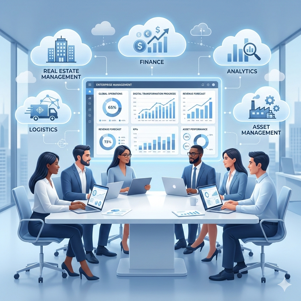 Ele conecta contratos, ativos, centros de custo, contabilidade e compliance.